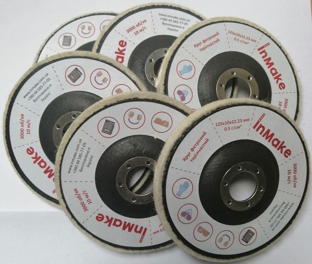 Фетровые круги торцевые предназначены для удержания полировочной пасты в месте обработки поверхности с использованием угловых шлифовальных машин. Круги применяются для финишного полирования изделий и предоставления им эстетического вида. Материалом обработки являются изделия из нержавеющих сталей, цветных и драгоценных металлов, лакокрасочных поверхностей, пластика, дерева, кожи и т.д.